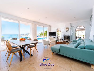 The single-storey living area is spacious and contemporary, featuring an open-plan kitchen, two ample sofas, a dining area, and direct access to the terrace and garden.